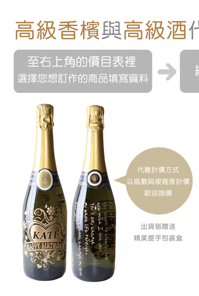 本公司可替客戶代酒瓶雕刻各式紀念酒與慶祝紀念香檳,如生日禮物紀念酒,結婚紀念酒、週年紀念酒、彌月紀念酒、榮陞紀念酒、週歲紀念酒….等,只要是您所想到的各式紀念酒或紀念香檳,本公司都能為您設計個人圖樣與代工雕刻。 歡迎使用電話連絡: 02-2659-7717